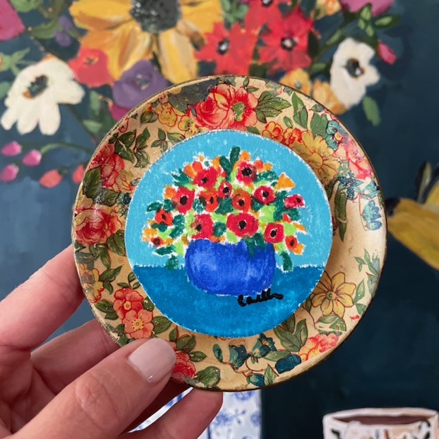 The artwork in this collection began when I found a beautiful, antique découpage wooden box with a set of small matching plates inside. The mini paintings are bold and bright and are mounted on top of the plate to make the perfect frame for each painting. These painting can me hung on a gallery wall ( I would suggest command strips as there are no hanging pieces attached to the plate “frame”) or work perfectly on a small art easel to be added to a shelf or tabletop.