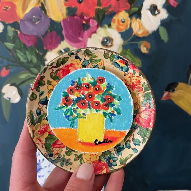 The artwork in this collection began when I found a beautiful, antique découpage wooden box with a set of small matching plates inside. The mini paintings are bold and bright and are mounted on top of the plate to make the perfect frame for each painting. These painting can me hung on a gallery wall ( I would suggest command strips as there are no hanging pieces attached to the plate “frame”) or work perfectly on a small art easel to be added to a shelf or tabletop.
