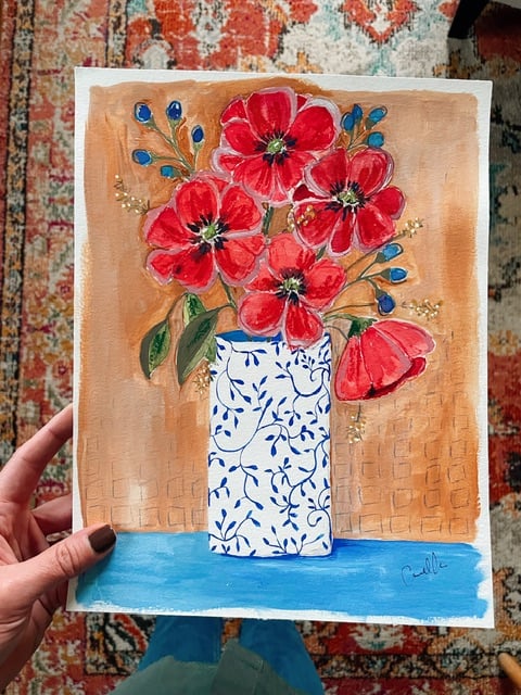 This bold, and bright poppy painting was done on cold pressed paper in gouache and finished with colored pencil, and oil pastel details. It measures 8.75 inches by 11 inches.