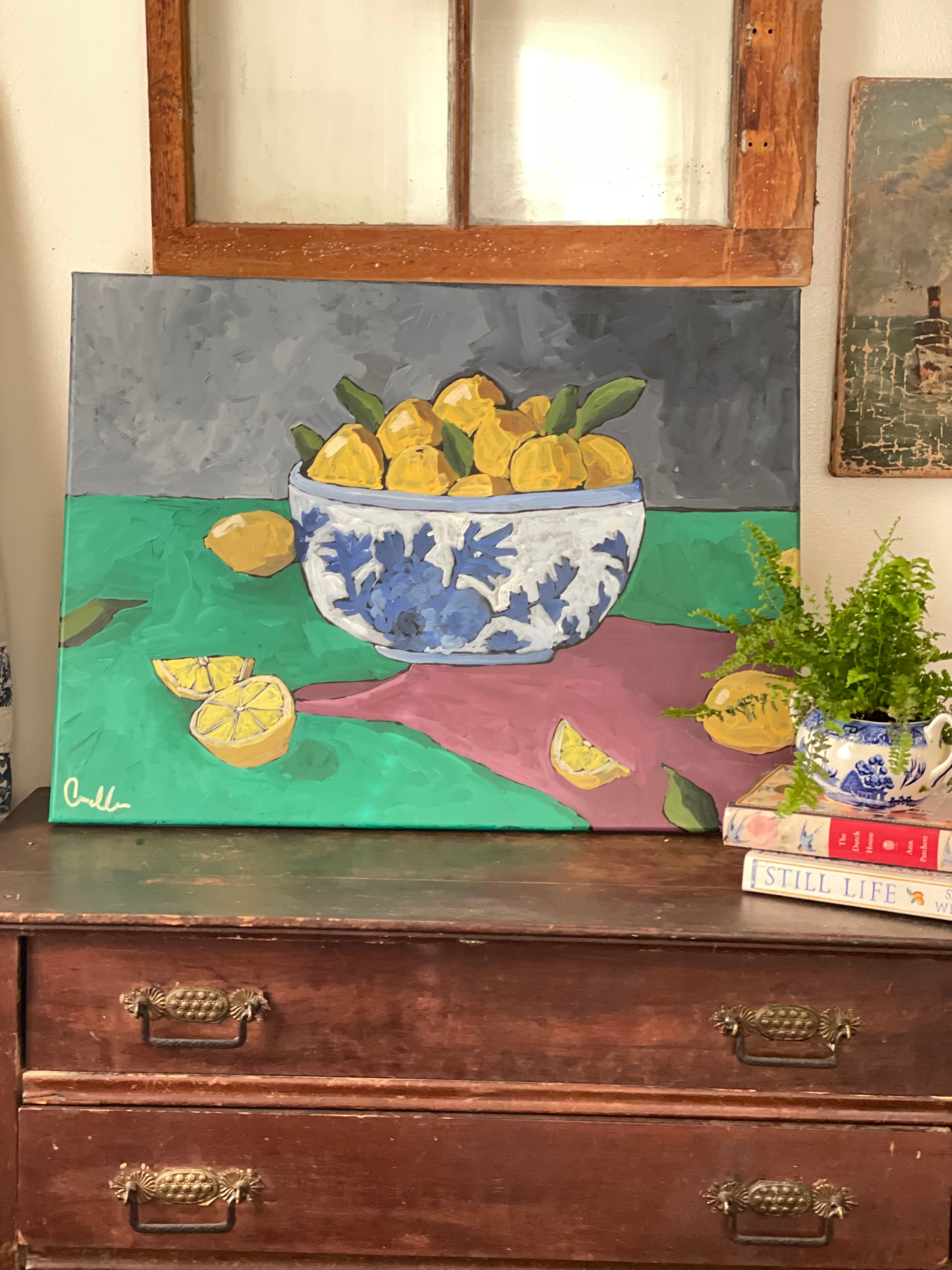 This original acrylic painting on canvas measures 18“ x 24“ . Lemons always remind me of the sweet, joyful parts of life that are sometimes nestled against the bitter moments in life too. It’s that balance that creates a full life, and those glimmer of pure joy shine through even brighter.