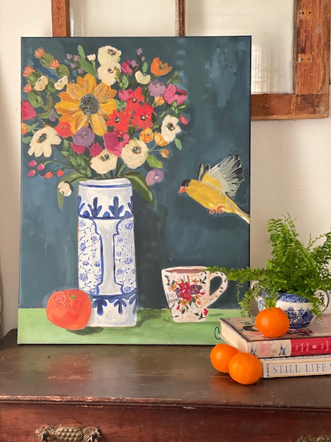 This original acrylic painting on canvas measures 18“ x 24“ . I painted this with pure joy in my heart. It is one of my very favorite paintings in the “The Joy of Living” collection I painted to share as the featured artist at my local library. It reminds me of the joy in unexpected places in life.