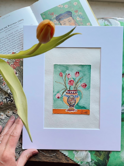 The paintings in this collection were done in richly pigmented watercolor on cold pressed paper and mounted on handmade cotton paper. It’s matted to fit an 8x10 frame perfectly!