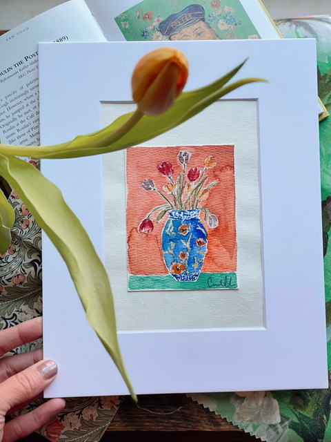 The paintings in this collection were done in richly pigmented watercolor on cold pressed paper and mounted on handmade cotton paper. It’s matted to fit an 8x10 frame perfectly!