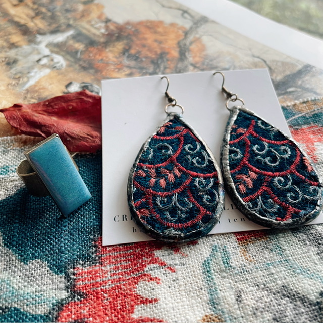 The earrings in the "Woven Together" collection are made of handcrafted, soldered pendants with a beautiful woven fabric detail. These earrings are such a joy to create, they are truly one of a kind.