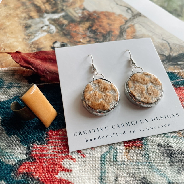 The earrings in the "Woven Together" collection are made of handcrafted, soldered pendants with a beautiful woven fabric detail. These earrings are such a joy to create, they are truly one of a kind.