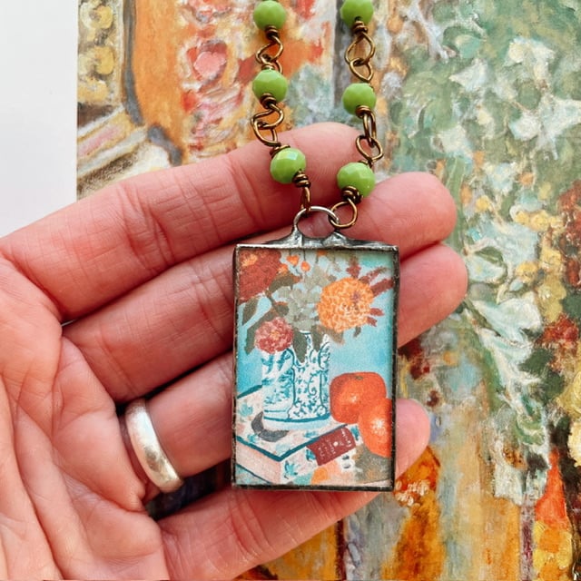 The necklaces in this collection have been handcrafted using prints of my own original artwork, with a soldered detail and hand beading to make them truly each one of a kind.